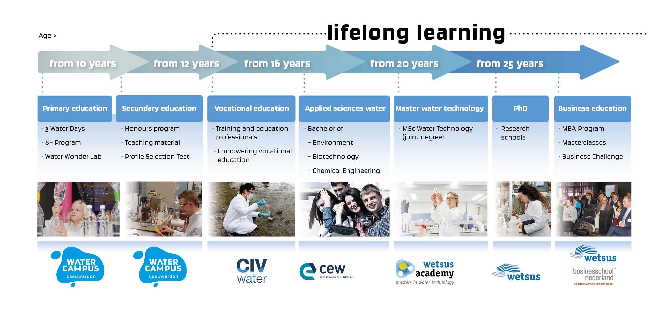 In addition, WaterCampus plays an important role in the national Human Capital Roadmap Water, in which all relevant players of the Dutch water sector cooperate in order to interest youngsters for a career in water. As a result, WaterCampus offers water technology education programs from primary school level, all the way to PhD-research, as depicted below: